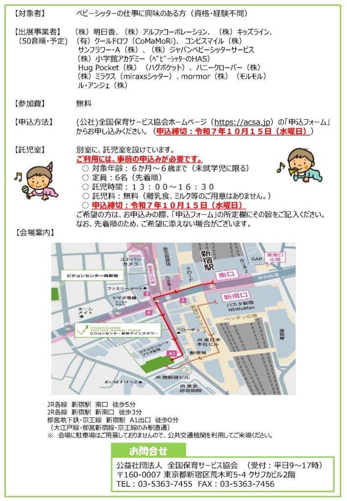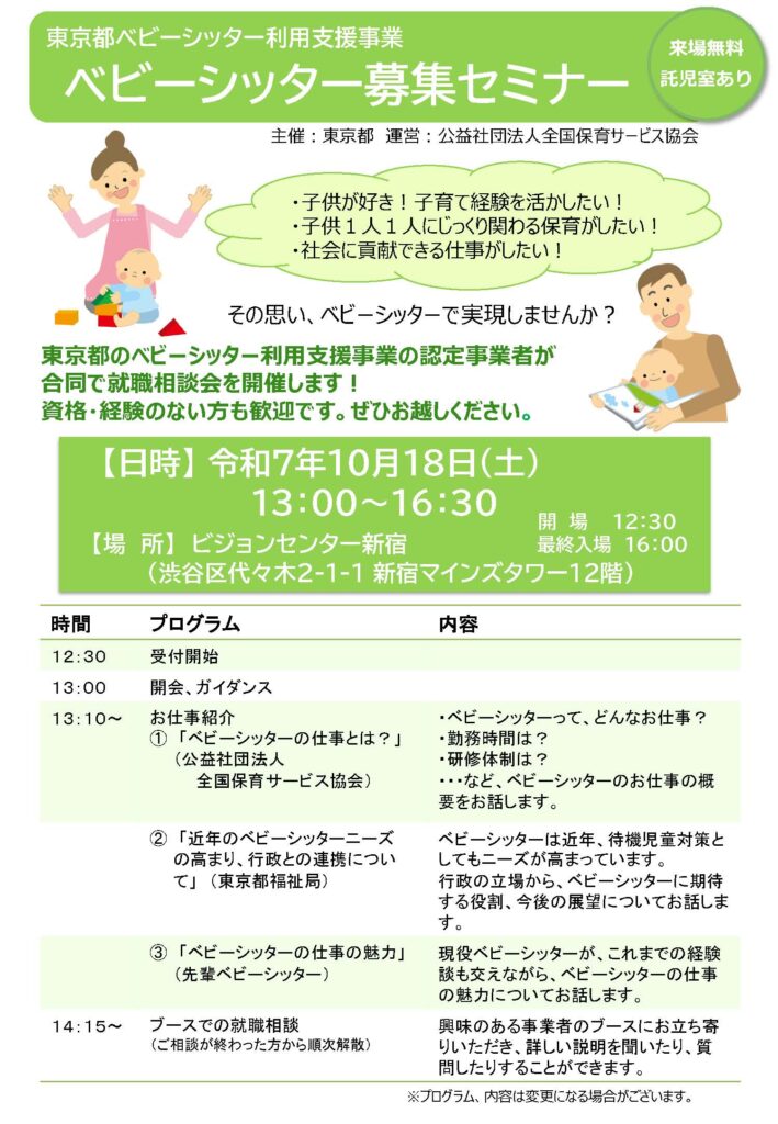 13:10 - 14:15 | 講演「ベビーシッターの仕事とは?」 (公益社団法人全国保育サービス協会) 講演「近年のベビーシッターニーズの高まり、行政との連携について」 (東京都福祉局) 講演「ベビーシッターの仕事の魅力」 (先輩ベビーシッター) |